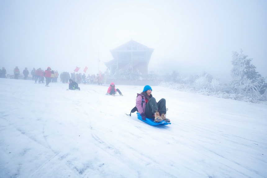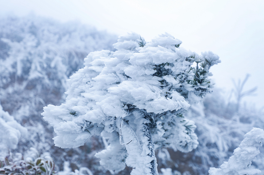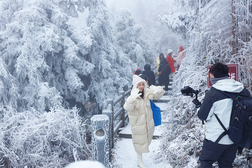 山顶老公路旁的雪亭周边是雾凇凝结最为密集之处,冰层厚处如琉璃砌墙,薄处似蝉翼透光,偶有红叶、黄草从冰中探出,点缀出一片静谧而斑斓的冬日画卷。游客们或驻足拍照,或轻声赞叹,在这南国的冰雪世界中流连忘返。