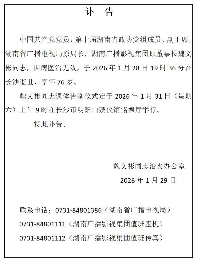 1月29日,湖南卫视官方微博发布消息,湖南省广播电视局原局长,湖南广播影视集团原董事长魏文彬,因病医治无效,于2026年1月28日19时36分在长沙逝世,享年76岁。